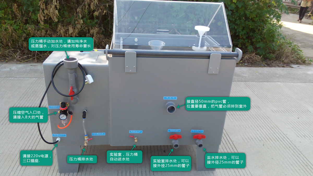 用于制造本設備的材料為耐腐蝕型5mmPVC塑料板材,不影響試驗結果。本設備設計工作中內外壓力平衡,鹽霧不會直接噴到樣品上。而且設計考慮到設備的頂部,內壁及其它部位會有冷凝水的產生,因而,本設備在試驗過程中,冷凝水不會滴落到樣品上影響試驗結果。
