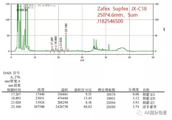 通過以上實驗可以看出,Zafex Supfex JX-C18液相檢測色譜圖,完全符合中國藥典要求,與其他品牌的色譜柱的出峰與雜質的分離效果圖對比,喆分色譜柱更適合藥典方法淫羊藿的液相檢測,為客戶提供一個更好的選擇。