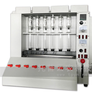 粗纖維測定的原理是利用酸堿消煮法提取粗纖維,在通過稱重測定其含量:在硫酸作用下,試樣中的糖、淀粉、果膠質和半纖維素經水解除去后,再用堿處理,除去蛋白質及脂肪酸,剩余的殘渣即為粗纖維。CXC-06粗纖維測定儀的外形尺寸為67cm×45cm×67cm,功率為2800W。在測定粗纖維含量時應注意樣品粉碎應能完全通過篩孔為1.0mm的篩,在酸煮后和堿煮后沖洗至中性過程中,宜用熱蒸餾水,易于過濾;灰化皿可用瓷坩堝代替。各類糧食、飼料、谷物、食品及其他農副產品中粗纖維的含量,均可采用粗纖維測定儀進行檢測。