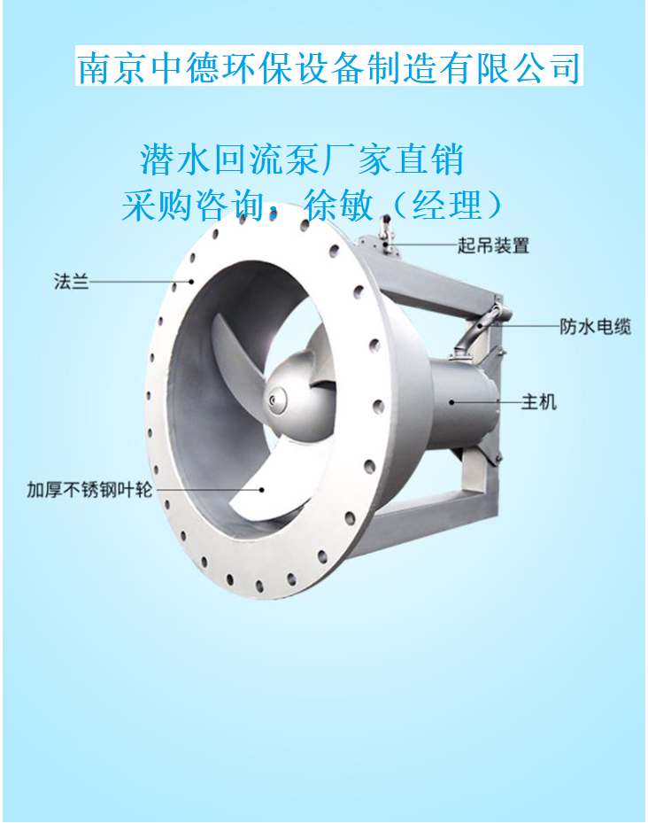 3、潛水回流泵葉輪——回流泵配技術的軸向運行的三葉輪,葉輪具有良好的自清潔與免震動功能。葉輪的設計同時可以滿足大流量與低揚程的要求,并在軸向形成大流量;
