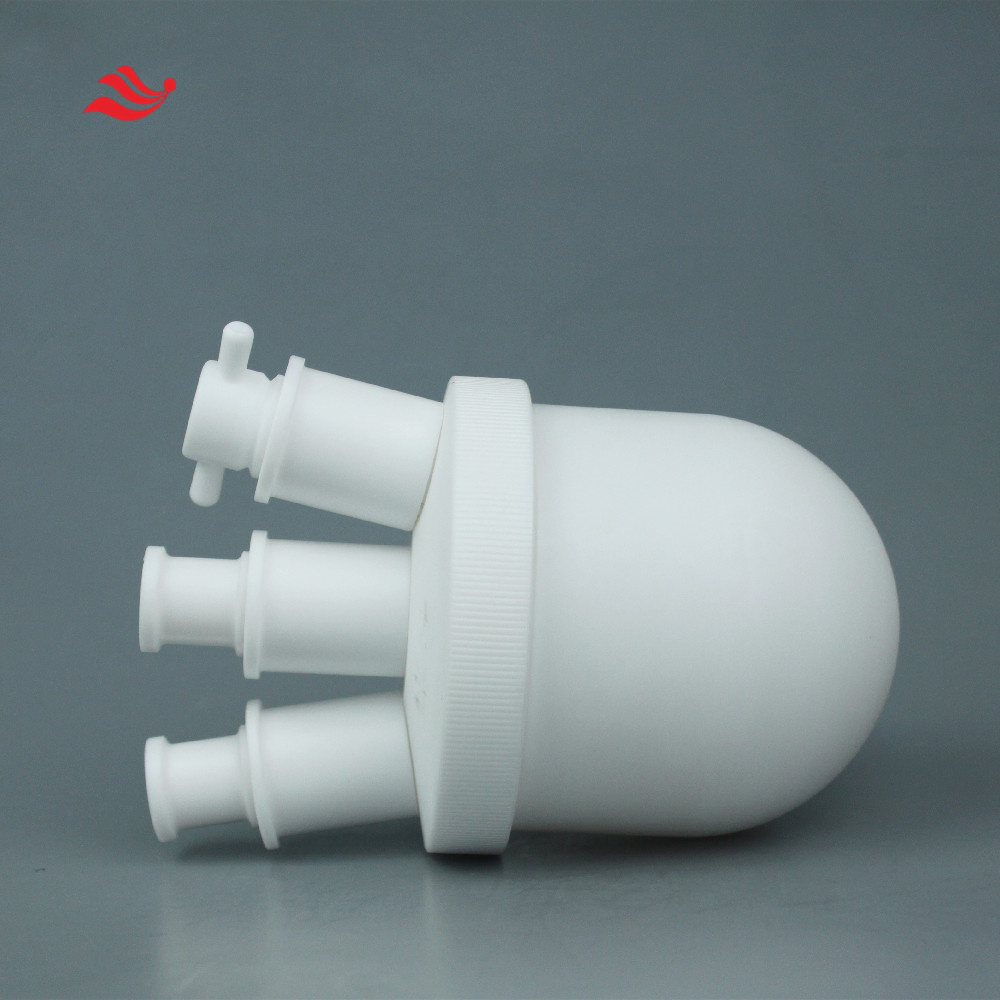 聚四氟乙烯燒瓶的窄口是用來防止溶液濺出或是減少溶液的蒸發,并可配合橡皮塞的使用,來連接其它的聚四氟乙烯器材。當溶液需要長時間的反應或是加熱回流時,一般都會選擇使用聚四氟乙烯燒瓶作為容器。燒瓶的開口沒有像燒杯般的突出缺口,傾倒溶液時更易沿外壁流下,所以通常都會用四氟攪拌棒輕觸瓶口以防止溶液沿外壁流下。