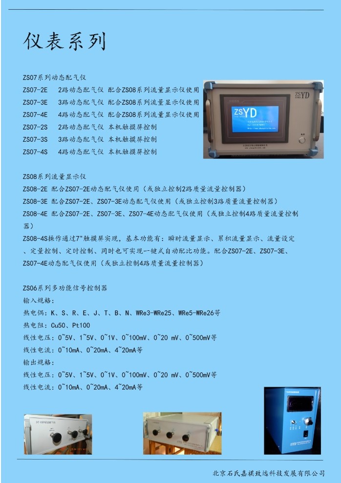 • ZS07系列動(dòng)態(tài)配氣儀 ZS07-2E 2路動(dòng)態(tài)配氣儀 配合ZS08系列流量顯示儀使用 ZS07-3E 3路動(dòng)態(tài)配氣儀 配合ZS08系列流量顯示儀使用 ZS07-4E 4路動(dòng)態(tài)配氣儀 配合ZS08系列流量顯示儀使用 ZS07-2S 2路動(dòng)態(tài)配氣儀 本機(jī)觸摸屏控制 ZS07-3S 3路動(dòng)態(tài)配氣儀 本機(jī)觸摸屏控制 ZS07-4S 4路動(dòng)態(tài)配氣儀 本機(jī)觸摸屏控制 ZS08系列流量顯示儀 ZS08-2E 配合ZS07-2E動(dòng)態(tài)配氣儀使用(或獨(dú)立控制2路質(zhì)量流量控制器) ZS08-3E 配合ZS07-2E、ZS07-3E動(dòng)態(tài)配氣儀使用(或獨(dú)立控制3路質(zhì)量流量控制器) ZS08-4E 配合ZS07-2E、ZS07-3E、ZS07-4E動(dòng)態(tài)配氣儀使用(或獨(dú)立控制4路質(zhì)量流量控制器) ZS08-4S操作通過(guò)7"觸摸屏實(shí)現(xiàn),基本功能有:瞬時(shí)流量顯示、累積流量顯示、流量設(shè)定、定量控制、定時(shí)控制、同時(shí)也可實(shí)現(xiàn)一鍵式自動(dòng)配比功能。配合ZS07-2E、ZS07-3E、ZS07-4E動(dòng)態(tài)配氣儀使用(或獨(dú)立控制4路質(zhì)量流量控制器) ZS06系列多功能信號(hào)控制器 輸入規(guī)格: 熱電偶:K、S、R、E、J、T、B、N、WRe3-WRe25、WRe5-WRe26等 熱電阻:Cu50、Pt100 線性電壓:0~5V、1~5V、0~1V、0~100mV、0~20 mV、0~500mV等 線性電流:0~10mA、0~20mA、4~20mA等 輸出規(guī)格: 線性電壓:0~5V、1~5V、0~1V、0~100mV、0~20 mV、0~500mV等 線性電流:0~10mA、0~20mA、4~20mA等